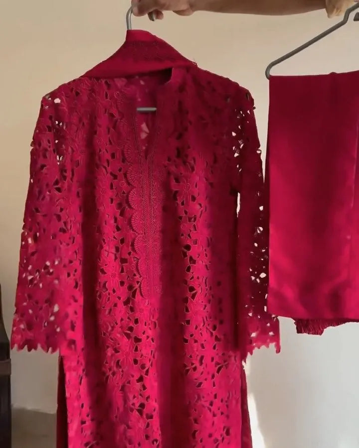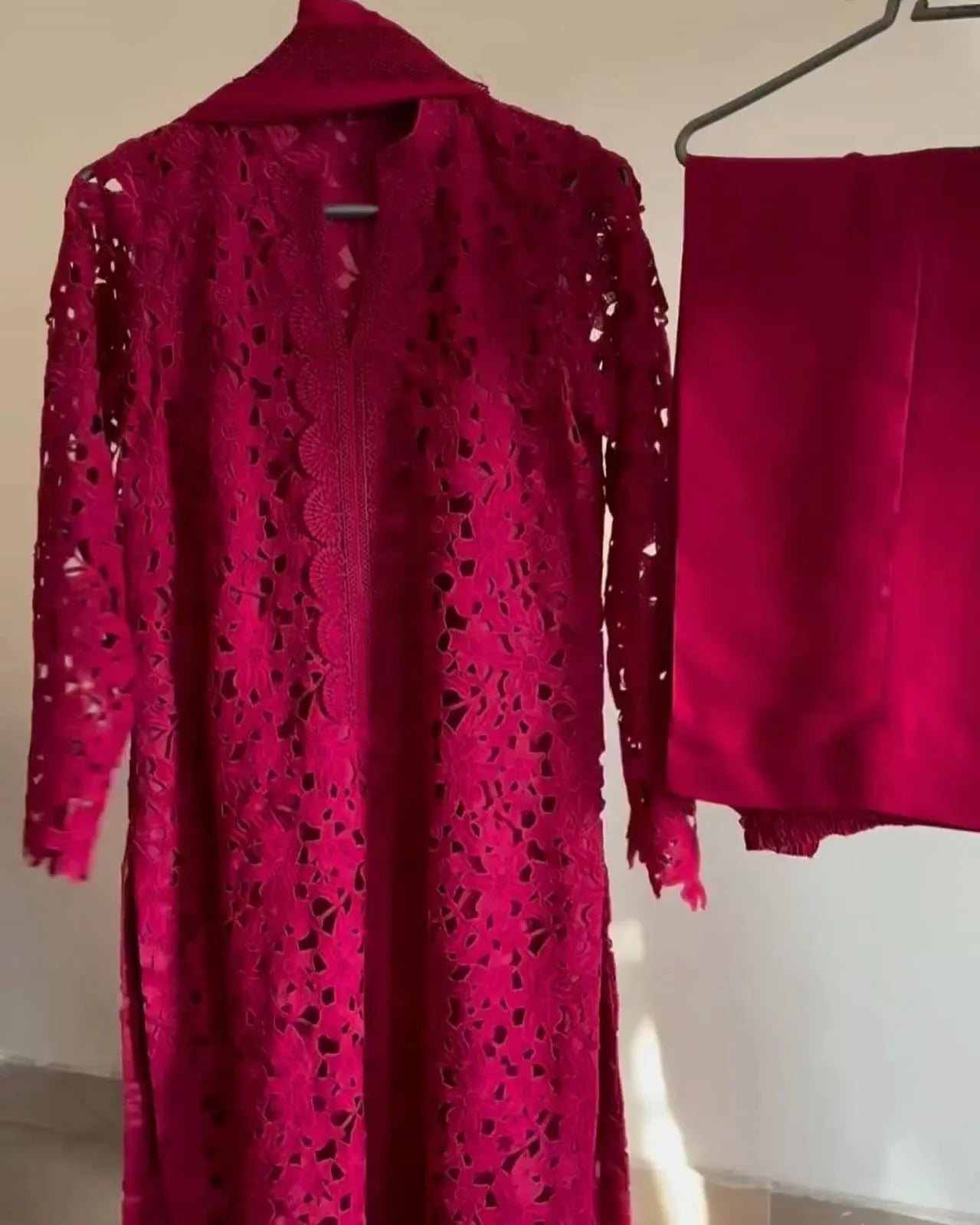 This elegant 3-piece stitched dress features a Croatia net cut work embroidered shirt with a cotton resham inner. The shirt...