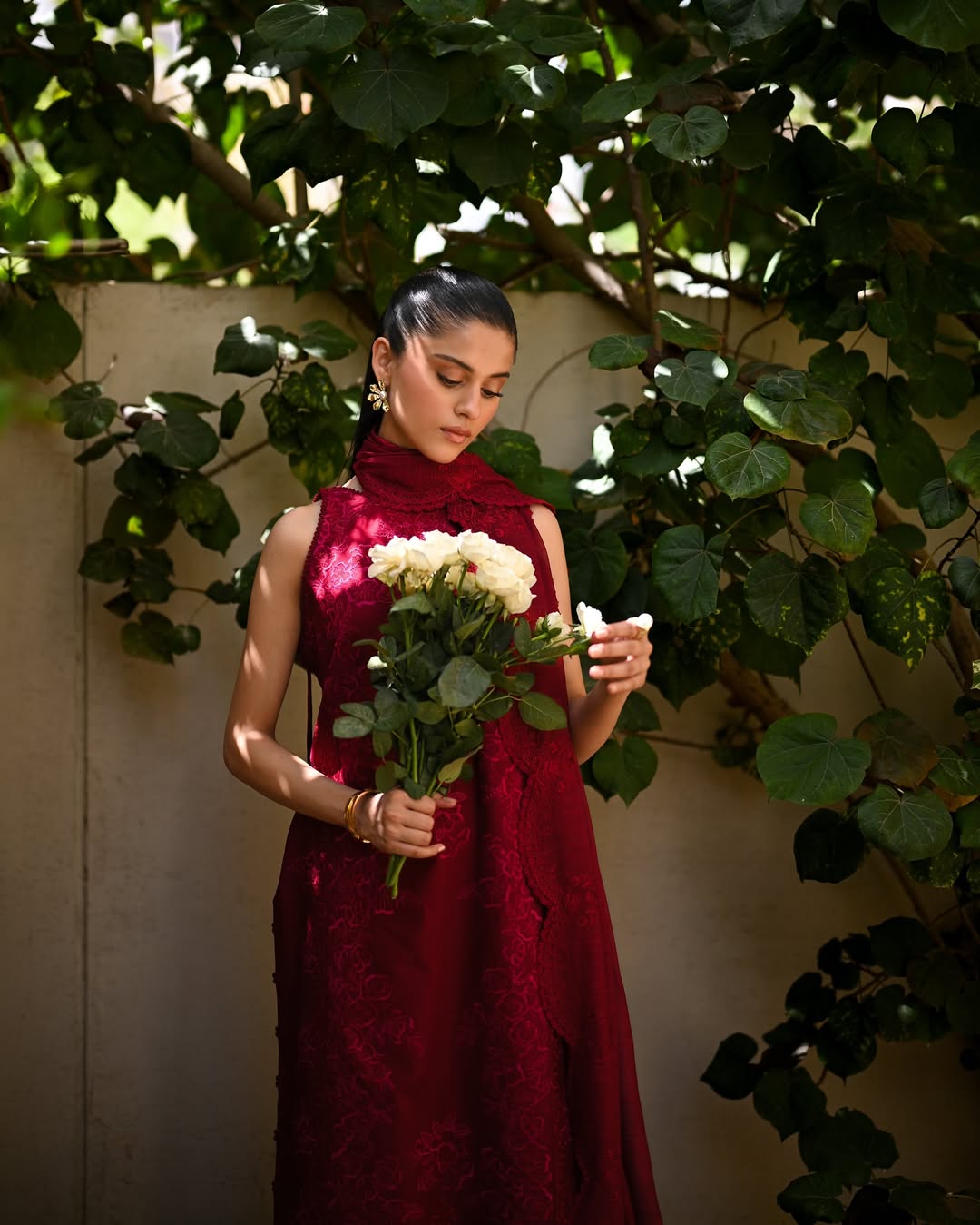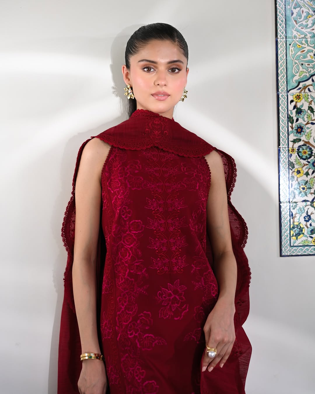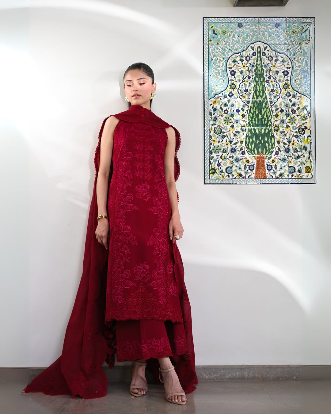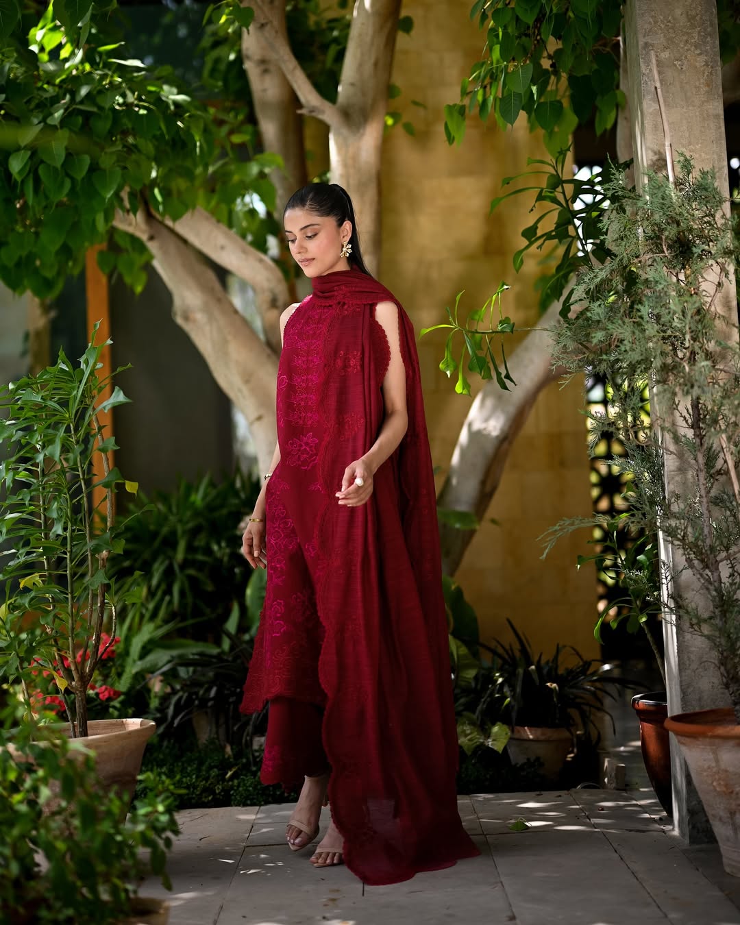 Introducing a vision of rich elegance by ADDI WEARS – this stunning maroon outfit showcases a fully embroidered shirt with...